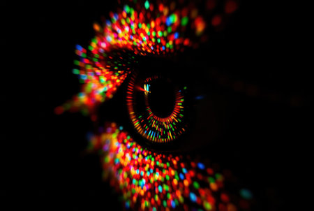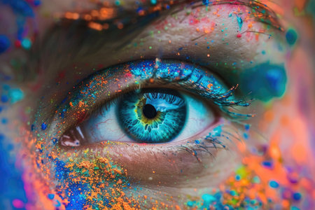 A captivating close-up of a human eye amidst a vibrant mix of colorful powders.