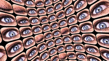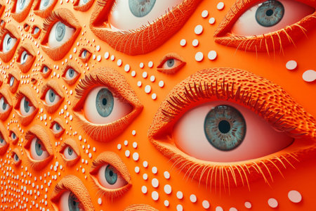 Abstract Orange Wall with Numerous Eyes and White Dots, Surreal 3D Rendering Illustration for Background or Conceptual Design
