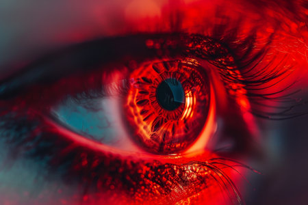 A dramatic close up of a womans eye with a vibrant red light shining on it, creating an intense and striking visual, Eye-catching red background with a sense of drama