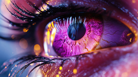 Detailed close-up of a mesmerizing eye featuring long eyelashes and a vibrant magenta iris, decorated with tiny water drops for an ethereal and charming appearance.