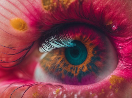 Macro closeup vivid colorful eye in creative makeup texture design. Contemporary fantasy color pattern face and eyeball painting in realistic digital artwork. Superb Generative AI.