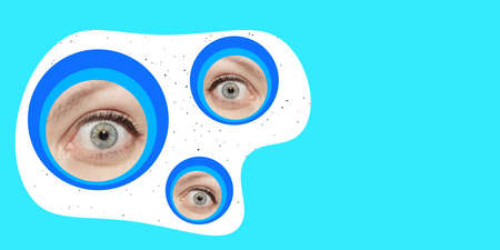 Creative design. Beautiful wide-open female eyes looking in multicolored circles isolated over blue background