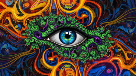 Two striking blue eyes gaze directly, enveloped by a mesmerizing array of intricate swirls and vivid colors. The artwork creates a dreamlike atmosphere of wonder and creativity.
