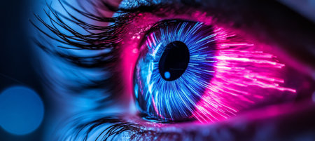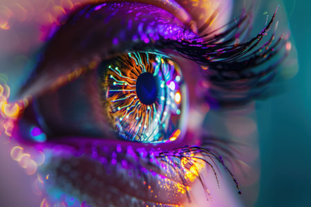 Close up of an iris reflecting colorful circuit patterns with vivid neon lights, creating a futuristic and mesmerizing effect