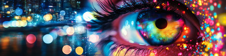 A captivating close-up of a human eye with a colorful cityscape reflected in the iris, surrounded by vibrant bokeh lights, evoking a sense of futuristic vision and creativity.