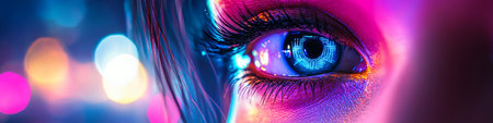 Cyberpunk Iris Scan Close Up of Woman s Eye with Digital Interface, Vibrant Club Lighting