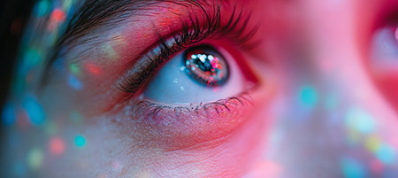 This captivating image showcases a close-up of an eye adorned with colorful eyeshadow and sparkling glitter, illuminated by vibrant neon lights.