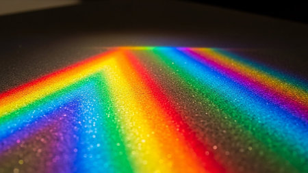 A vibrant rainbow spectrum of light is refracted through a prism, creating colorful bands on a textured, sparkling surface.