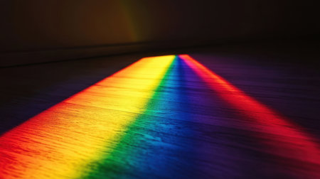 This image captures a vibrant rainbow light projection across a wooden floor, creating an enchanting atmosphere filled with color and warmth.