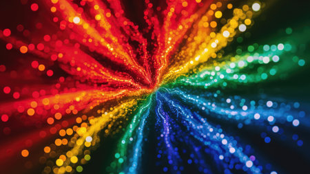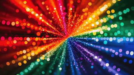 An abstract image featuring a vibrant rainbow bokeh effect radiating outwards creating a dynamic and colorful visual.