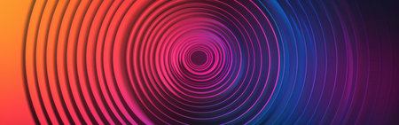 A digital abstract image features a series of concentric circles that radiate outwards in a swirling, hypnotic pattern. The circles are rendered in a colorful gradient of orange, pink, purple, and blue, creating a visually dynamic and abstract design.