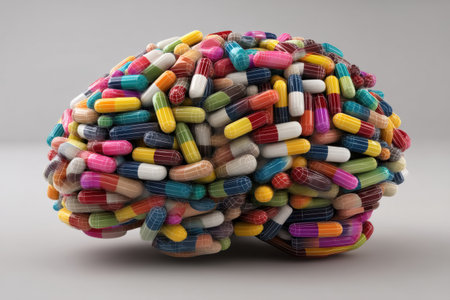 Tiny vitamin capsules are artfully arranged form vibrant human brain shape, highlighting importance of nutrition in cognitive health and promoting well being through diet choices