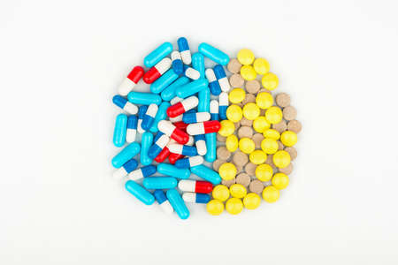 Medical colorful pills, capsules or supplements for the treatment and health care on a light background.