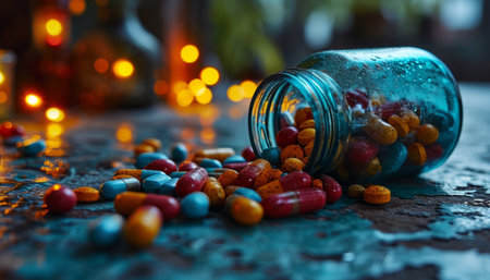 Pills spilling out of glass bottle on rustic background with bokeh lights