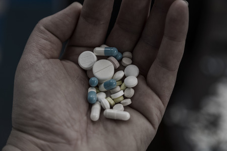 A person is holding a handful of pills. Medical and Health care concept