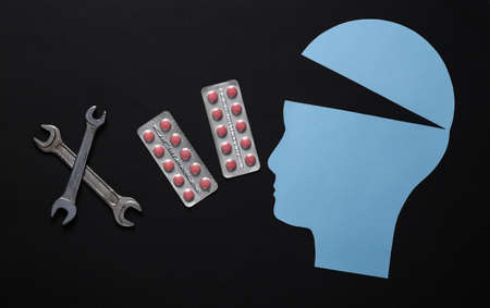 mental therapy concept. Paper silhouette of a human head with pills and wrench on a black background. flat lay
