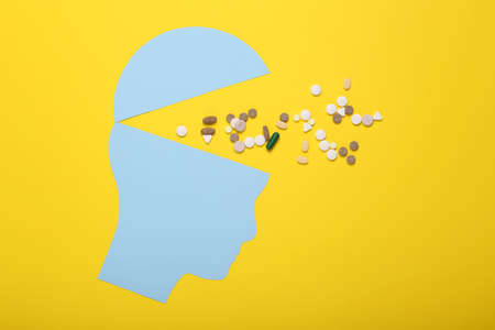 Open your mind, mental health concept, creative thinking. Paper silhouette of human head and pills on yellow background