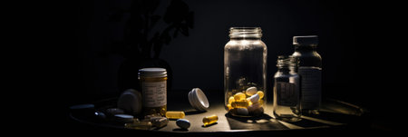 A table topped with bottles of pills and bottles of medicine. Generative AI image.