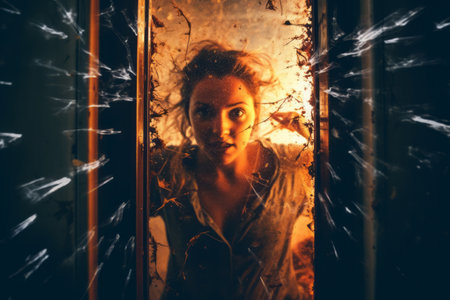 A terrified woman peering through a cracked door. Concept suspense and anticipation for a horror-themed event. Generative AI