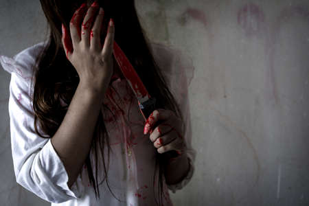 Ghost woman or zombie holding knife for kill with blood violence in house of ruin, nightmare, horror of scary fear on hell is monster devil in halloween festival, copy space the right.