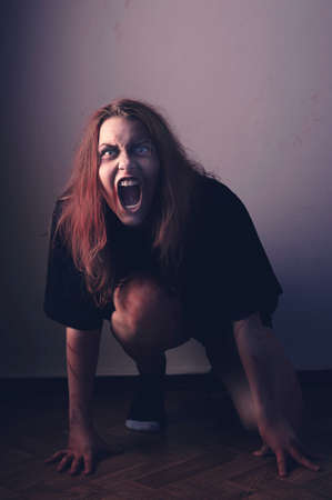 Halloween horror. Crazy bloody scary zombie woman looks into the camera and screams on black background
