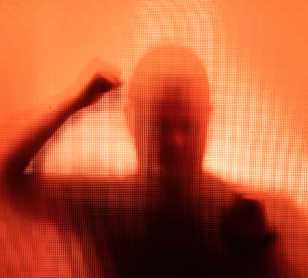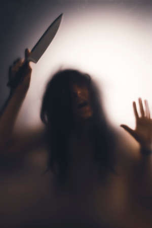 Horror, halloween background - Shadowy figure behind glass holding a knife