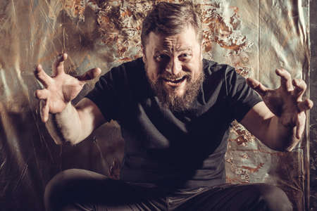 emotional man with a beard gesturing with his hands close-up studio aggression