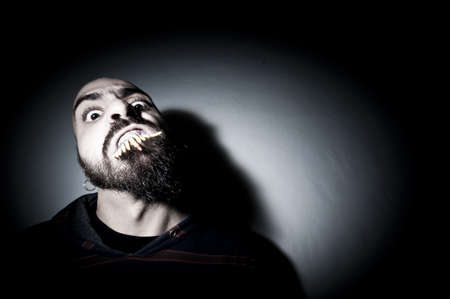 Frightening man in skeleton Halloween cosplay costume. Fashion art design. Guy in creepy skull makeup making faces, showing tongue, trying to scare. Day of The Dead. Black background. Black and white