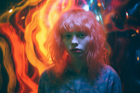 A young person stands in profile, enveloped by vibrant, swirling colors that cast beautiful light patterns on the wall around them. The interplay of hues creates a captivating backdrop that enhances the introspective atmosphere of the moment.