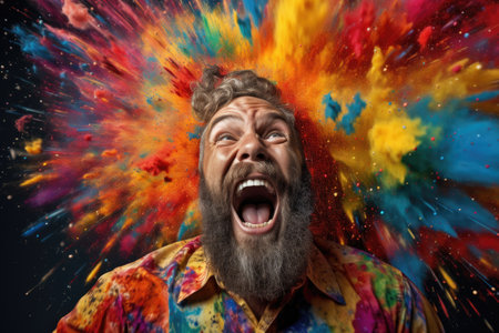 A man with a beard showcasing his creativity by adorning his face with vibrant and eye-catching paint, Man in an explosion of colorful joy, AI Generated