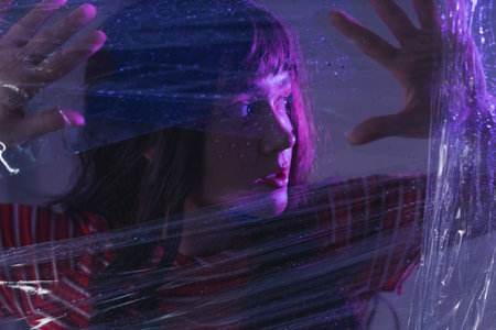 Caucasian young adult woman trapped behind layer of plastic wrap looking away from camera in fear. Artistic portrait photography. Horizontal shot. High quality photo