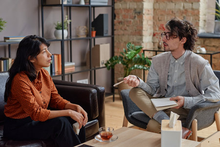In a well-lit interior setting, a therapist and patient are engaged in a counseling session. The scene showcases two individuals seated in comfortable armchairs. The color palette includes natural tones and hints of green from a nearby plant. It is suitable for a wide range of editorial and commercial applications.