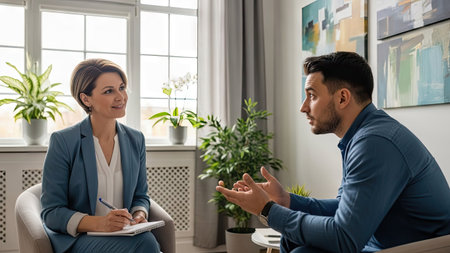 An image portrays a therapist engaged in a counseling session with a patient. The indoor scene features natural lighting and decorative plants. The individuals are dressed in professional attire. This visual can be suitable for articles related to mental health or therapeutic processes, and various other editorial needs.