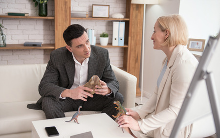Toy therapy. Desperate uneasy man using toys while mature woman making him tranquil