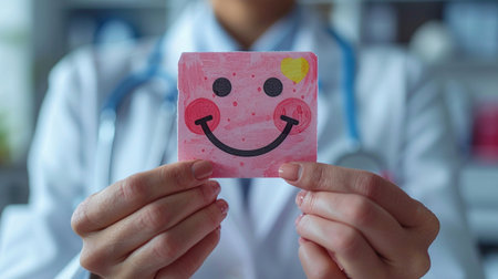 Healthcare professional holding card with hand-drawn smiling face closeup image, ai generated. Message of positivity close up photography. Compassionate care in medical field concept photo realistic