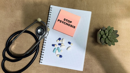 Concept of Stop Psychosis write on sticky notes isolated on Wooden Table.