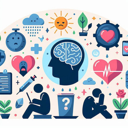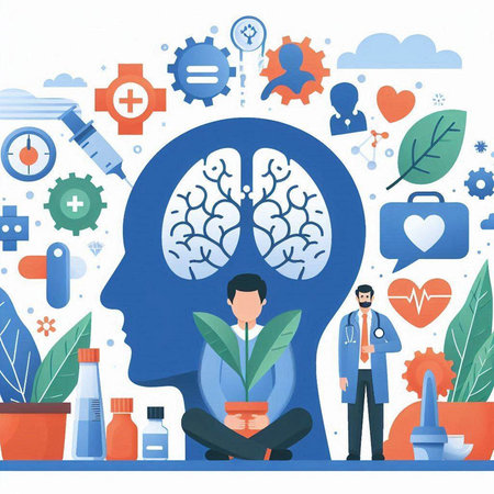 concept of mental health and well-being with a drawing of a brain and a vial of medicine