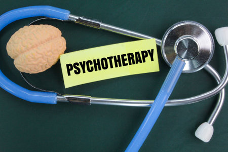 stethoscope, brain and colored paper with the word psychotherapy. the concept of mental health or mental disorder