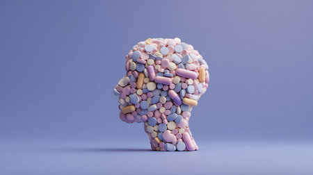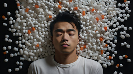 Human with pills inside his head, for World Mental Health Day, created using Generative AI technology.