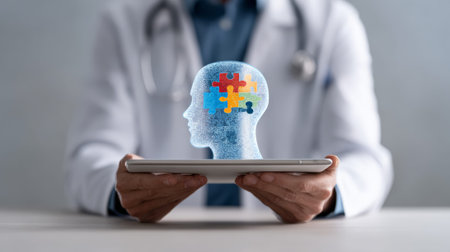 Healthcare professional holding a digital tablet showcasing a human head outline filled with colorful puzzle pieces, representing mental health, psychology, and neurological understanding