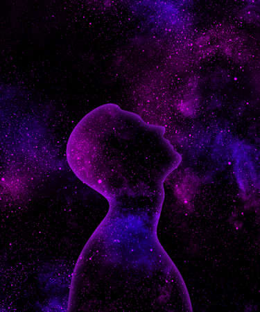 Purple and blue shining universe in the form of a male silhouette looking up on a starry space background