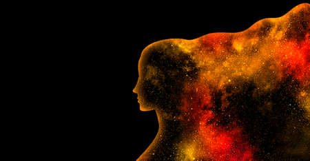 Yellow and red shining star universe in the shape of a woman's profile silhouette on a black background