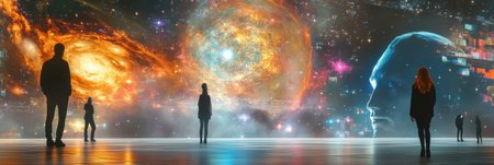 Visitors engage with captivating virtual artworks in a digital gallery set against a stunning cosmic backdrop featuring glowing galaxies.