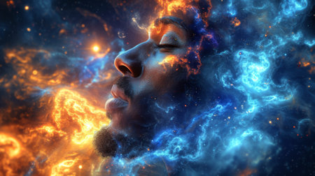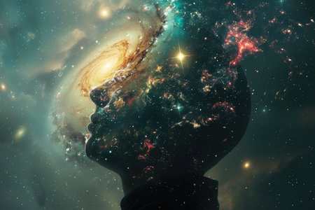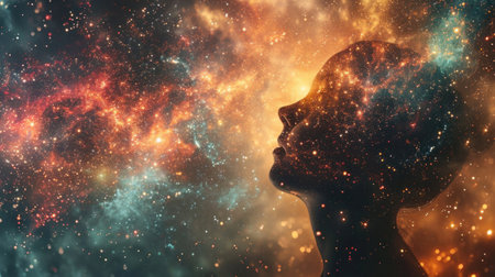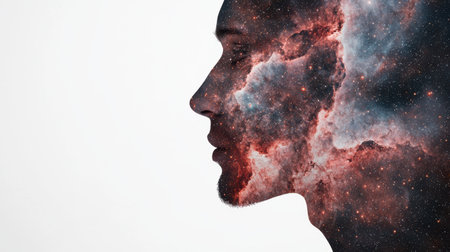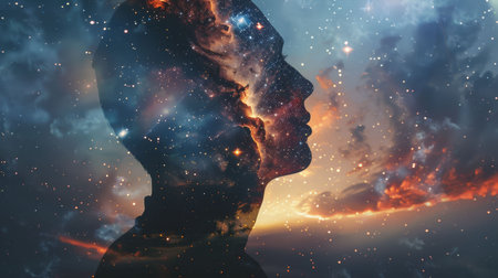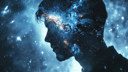 A striking profile of a man showcases a cosmic galaxy flowing around his head, capturing the beauty of the universe and human contemplation. Stars and planets enhance the visual story.