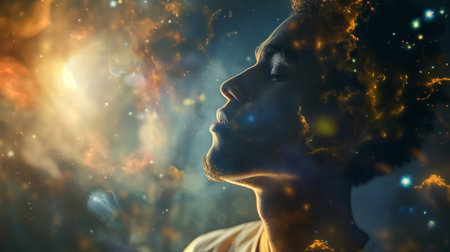 A man stands in profile, glowing with cosmic light, as vibrant galaxies and stars surrounding him. The warm golden backdrop amplifies his thoughtful expression, evoking a sense of wonder.