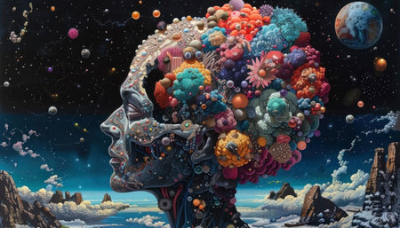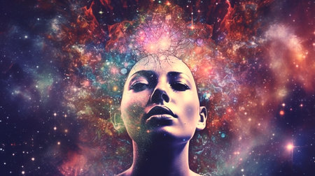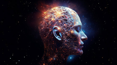 A surreal image of human head revealing cosmic explosion of colors and light