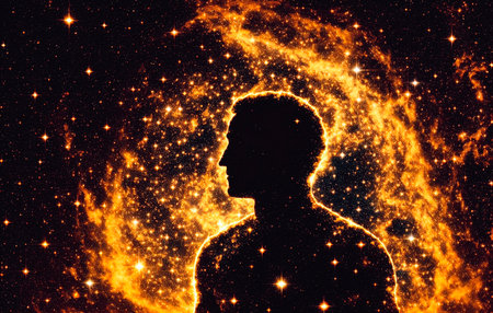 A man's face is obscured by a cloud of glowing particles. Concept of mystery and wonder, as if the man is experiencing a moment of deep thought or contemplation