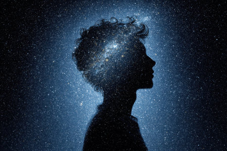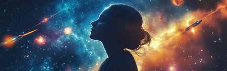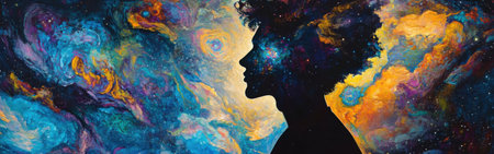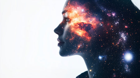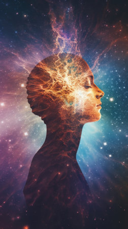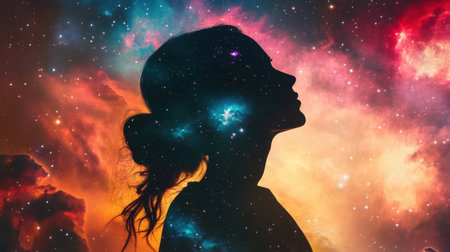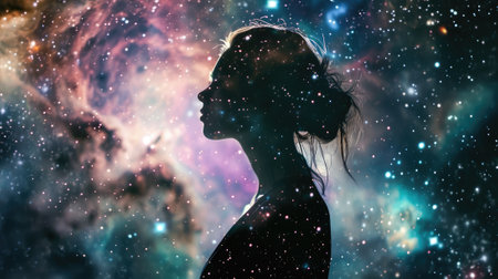 A silhouette of a woman against a cosmic background, showcasing the beauty of the universe and human imagination intertwined
