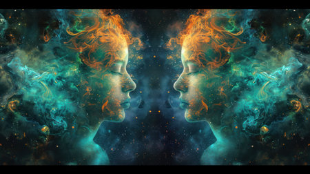 Abstract Gemini zodiac sign in cosmic harmony. Two mirrored Gemini faces merge in a swirl of stars and nebulous colors.