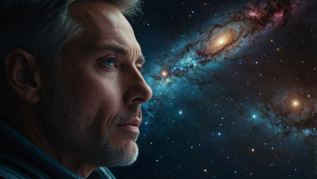 AI Generated. cosmic expanse, a man reflects on the boundless beauty of the galaxy, his eyes filled with a mix of curiosity and introspection